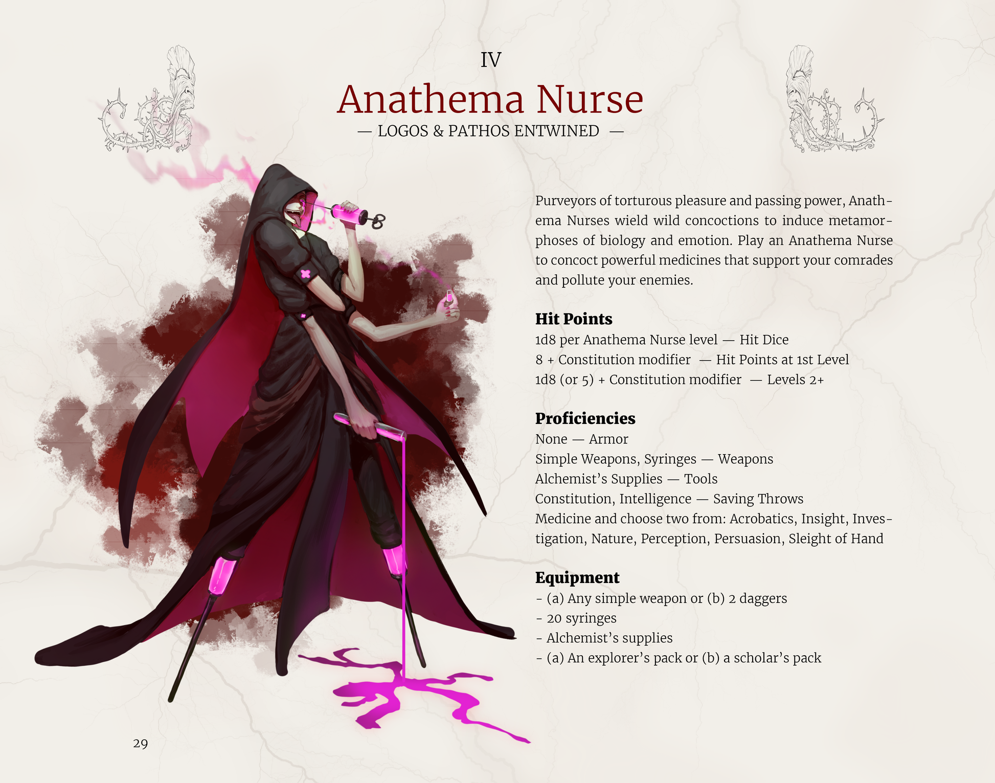 Choose how you would give worship to the Blood Queen. Twist logic and passion together as an Anathema Nurse, sing apart reality as a Flesh Singer, or commit yourself to unholy matrimony as a Medusite. The paths to the mother's love are myriad.